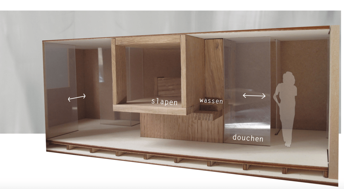 Een ontwerp voor een hotelkamer bestaande uit een vast eikenhouten element en doorzichtig, mat of beweegbaar glas. In eerste instantie is onduidelijk wat binnen en wat buiten is.