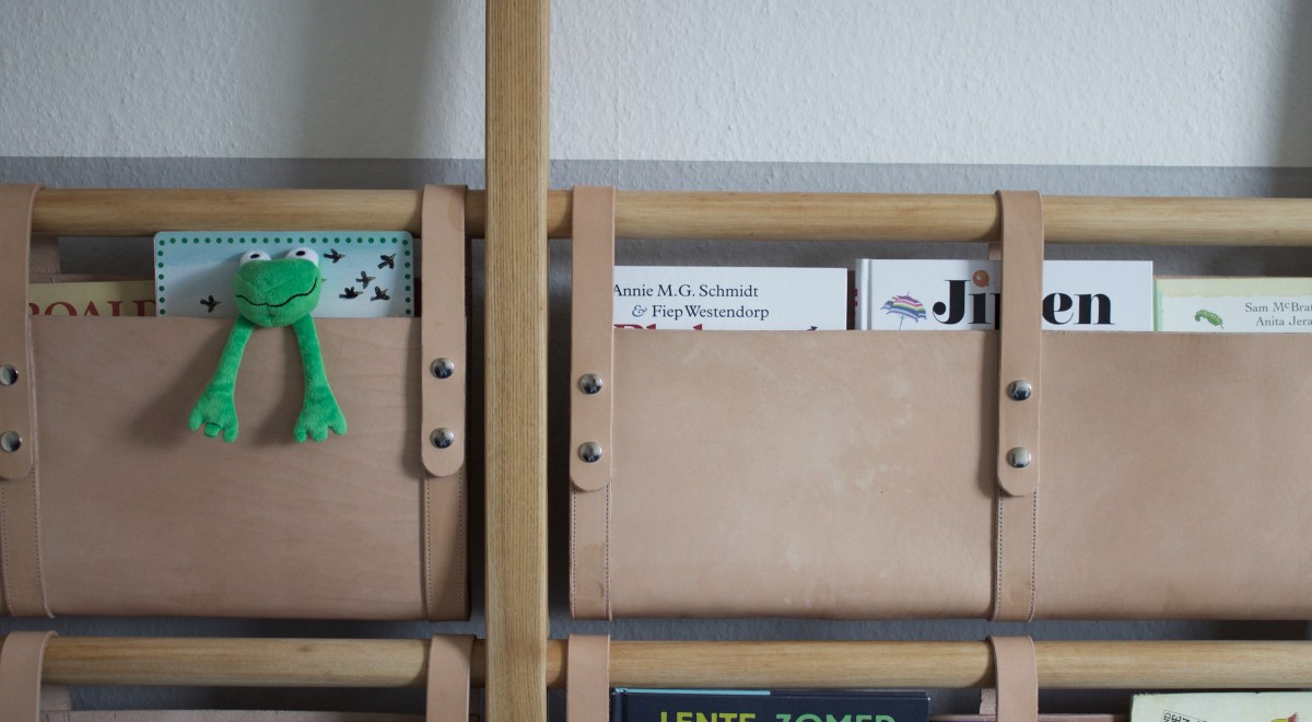 Lien is (nu al!) gek op lezen. AV Interieurontwerp knapt voor haar een oud gymtoestel op en ontwerpt, in samenwerking met Atelier IWG, boekentassen van tuigleer.